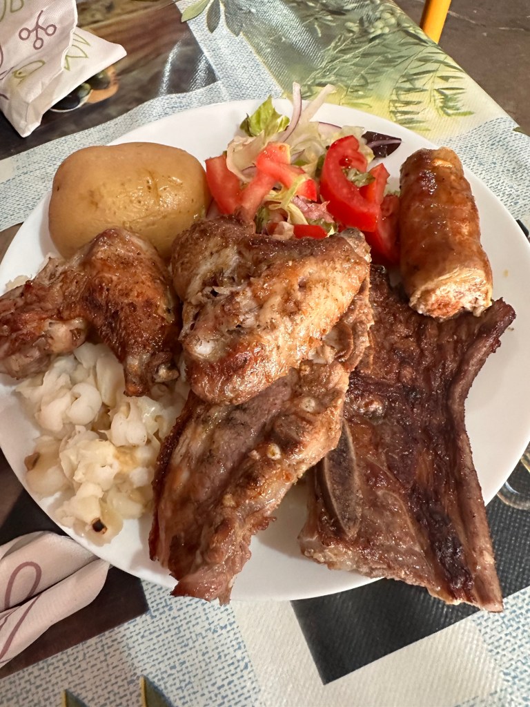 Then the plate came with four meats: sausage, chicken, pork, and beef.