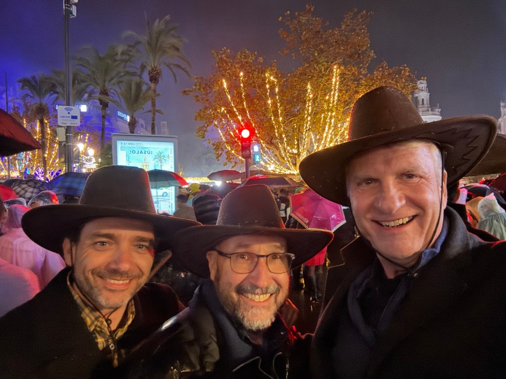 Afterwards, we went to City Hall Plaza in the rain for the midnight fireworks. Sadly, we (and thousands of others) missed the memo. The fireworks were moved to the Turia River Gardens. But, we looked great in our matching sombreros!