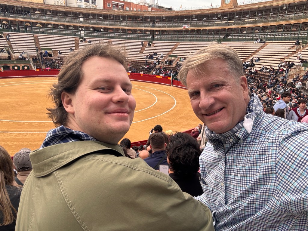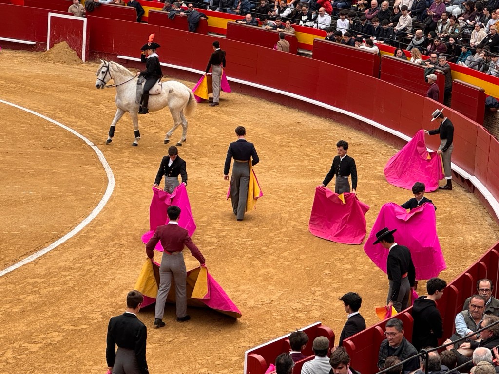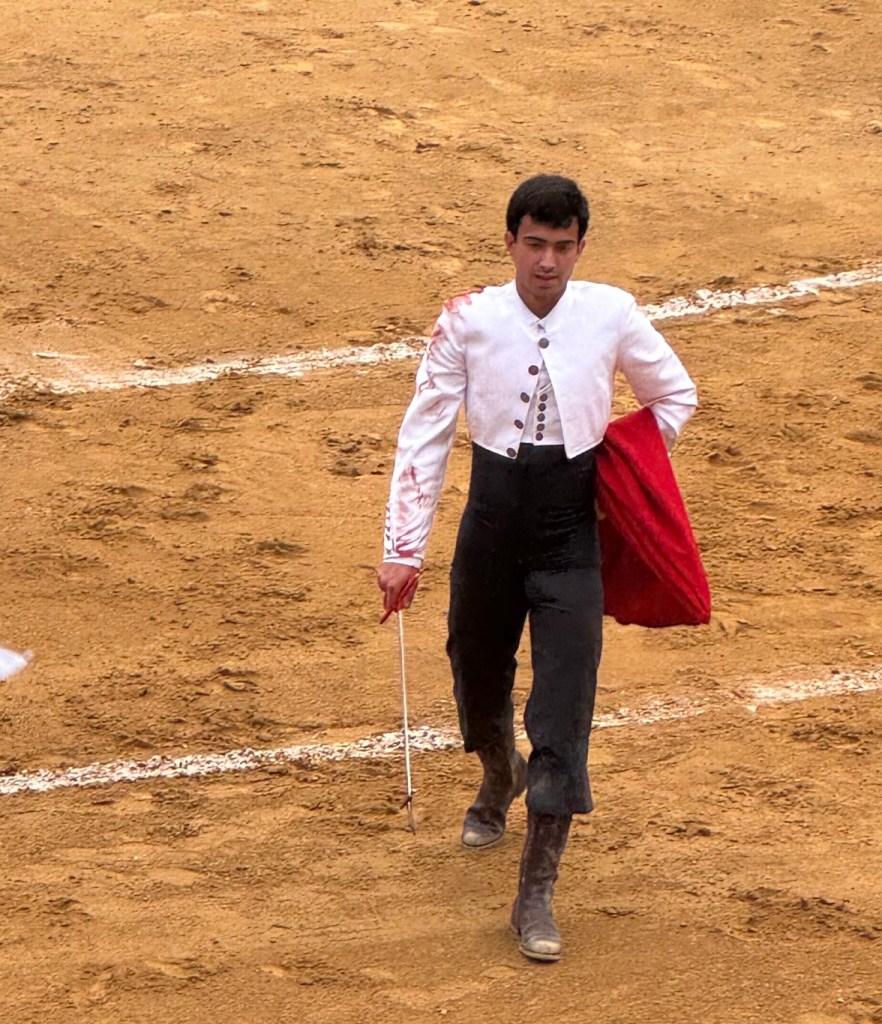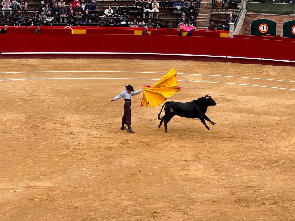 We asked the man behind us and learned that they were presenting a free bullfight, with younger, student Matadors. Normally, a bullfight is close to 100€ to get in. So, with some trepidation, we stayed for the first kill.