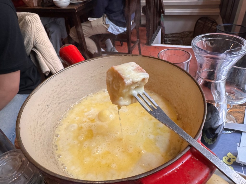We stopped for lunch and enjoyed real fondue. We chose a cheese combination of Beaufort, Reblochon and white wine, with a charcuterie board of hams and sausage. Tres magnifiqué!