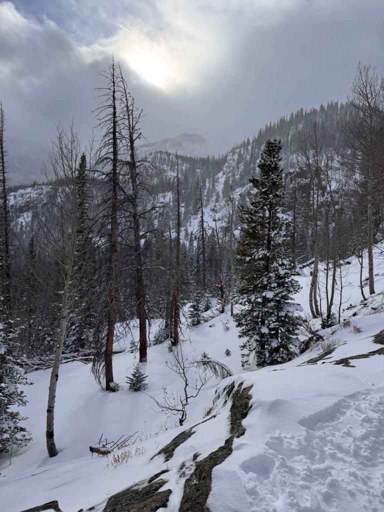 We hiked from Bear Lake, up to Nymph Lake, to Dream Lake. By the time we got to our destination, Mike estimated winds at 40-50 miles per hour. We didn’t stay long there!