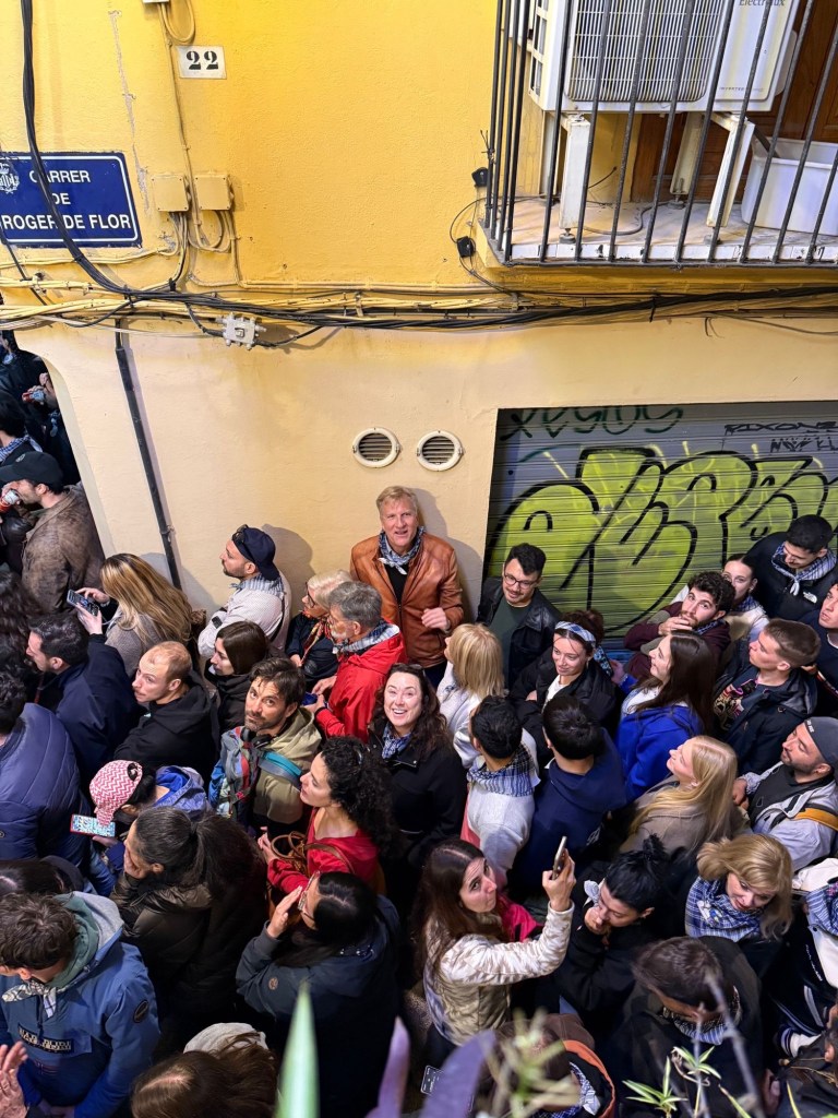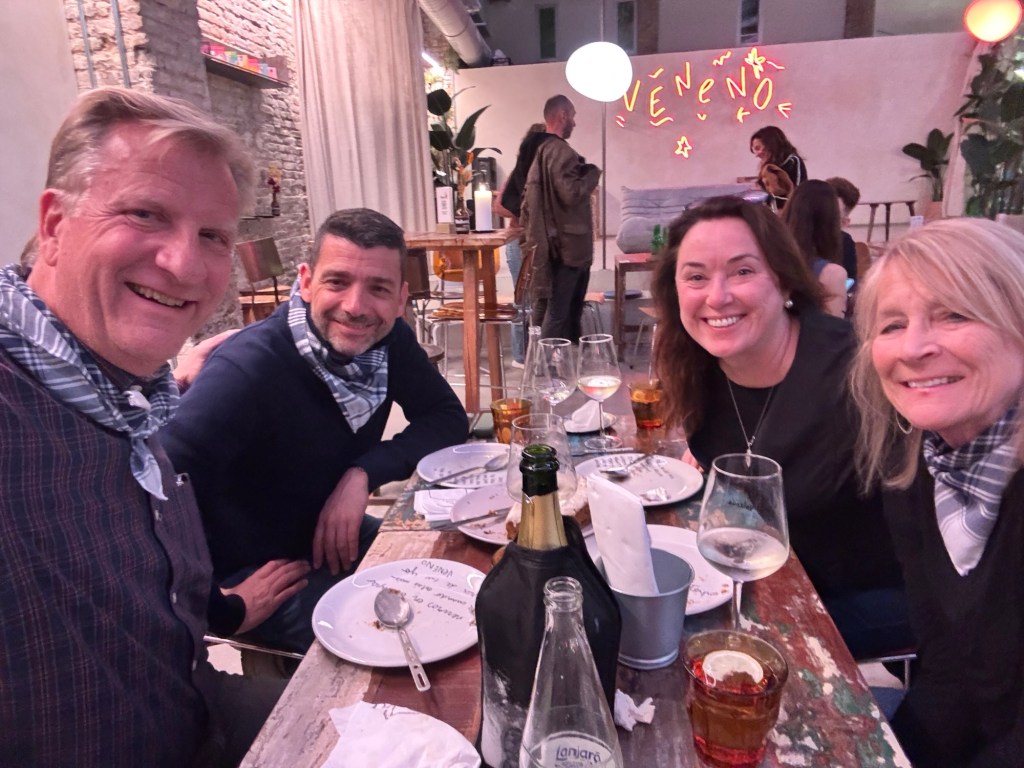She and her host (Marco) invited us up. The crowd all around us started saying, “Yes! We’re Jim’s friends too!” We all laughed. And Debra, Sue and I were allowed to pass to the apartment door!