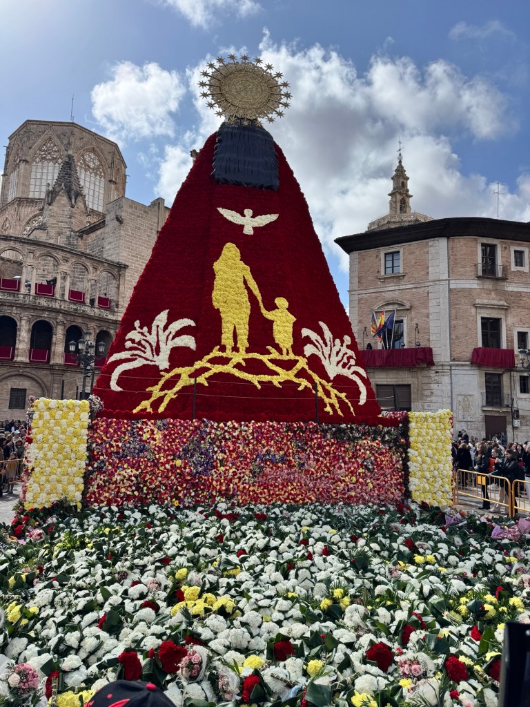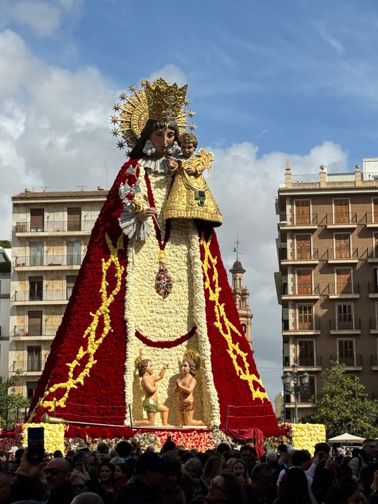 One of the beautiful traditions of Fallas is the “Ofrenda,” the offering of flowers to the Virgin. Each of the more than 400 Cassels marches in traditional dress, bringing bouquets of flowers to a 3-story tall wooden statue of the Virgen de los Desamparados.
