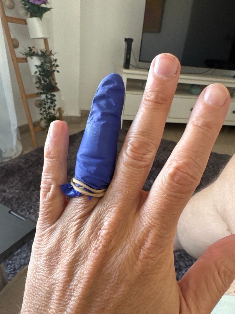 As a safe guard, I cut a rubber glove and created a “finger glove.” No sand. No water. No infection.